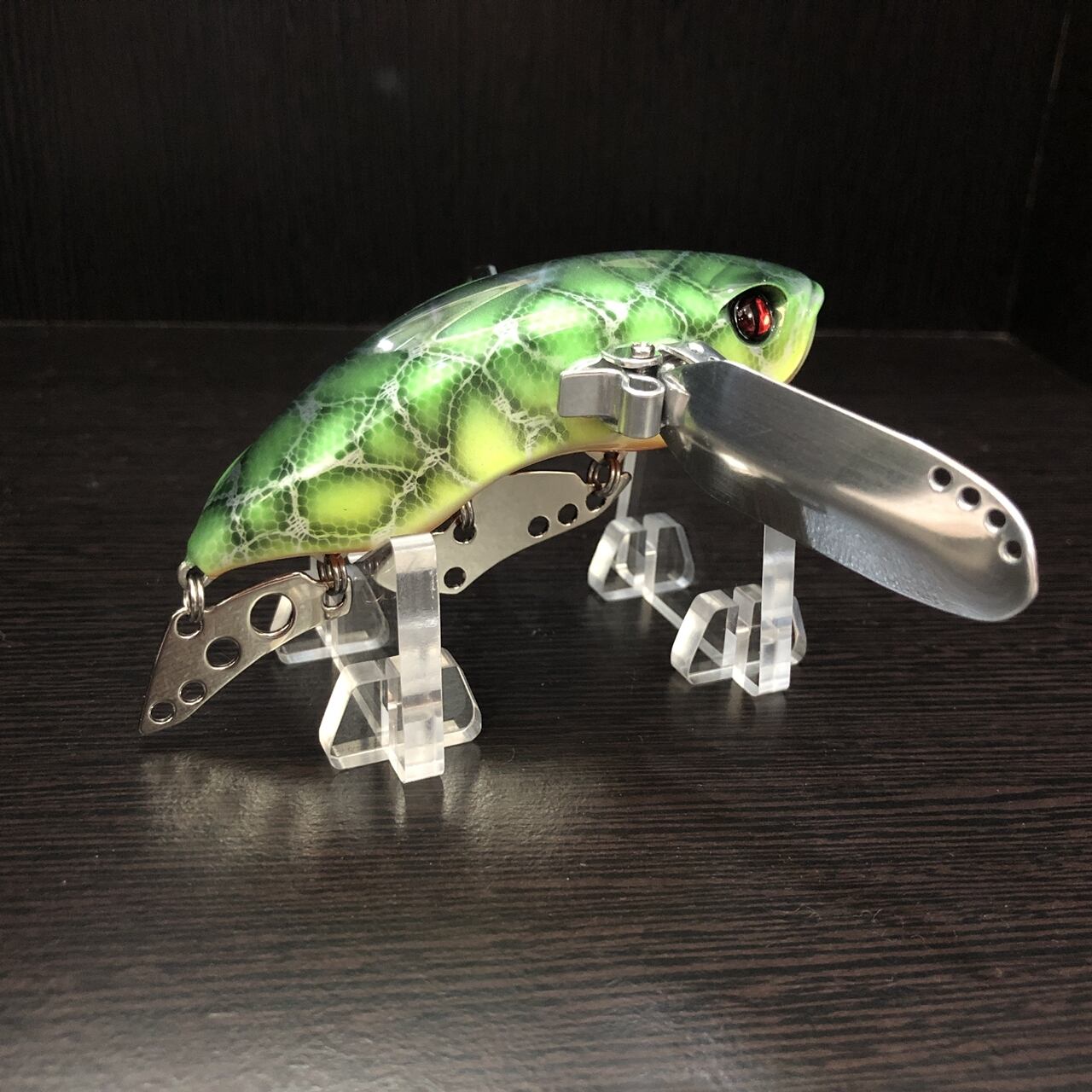 羽根モノ特有のカポカポやピコピコした音を極力抑え、スローに巻いた時にピチャピチャといった水面を軽く叩くような優しい音になるように設計しています。