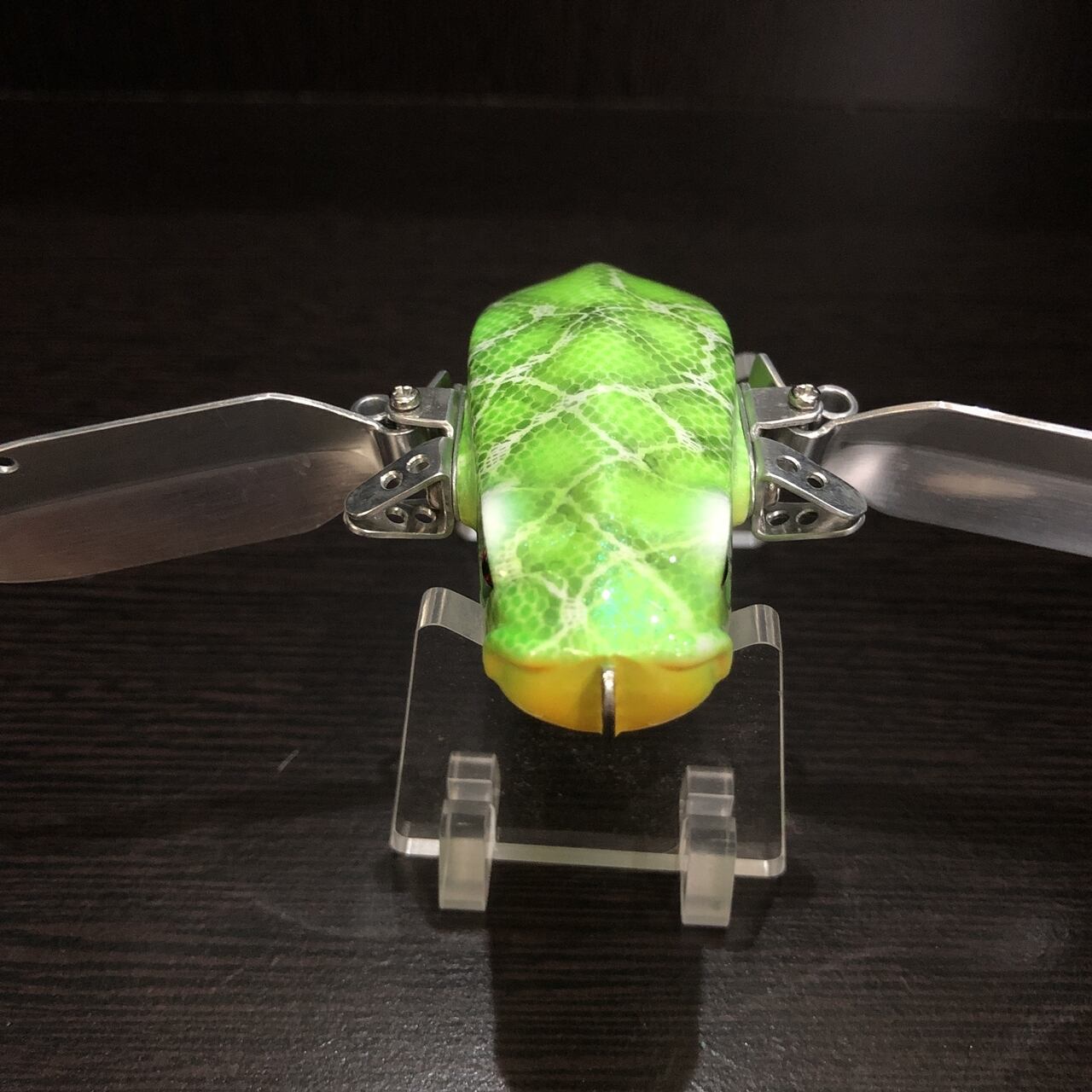羽根モノ特有のカポカポやピコピコした音を極力抑え、スローに巻いた時にピチャピチャといった水面を軽く叩くような優しい音になるように設計しています。